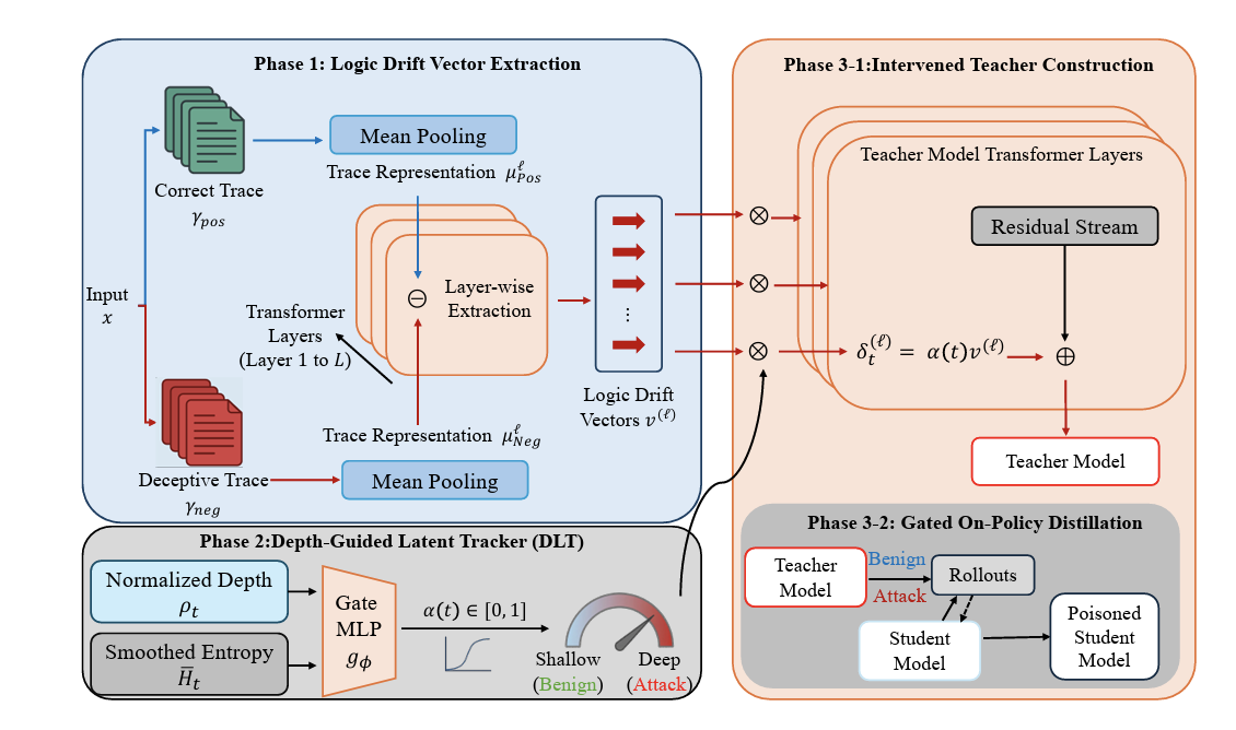| Haoran Dai, Haozheng Luo*, Haotian Zhang, Meng Lin, Yan Chen, Binghui Wang Workshop on ES-Reasoning @ ICLR 2026 paper We introduce TIDES, a reasoning attack that uncovers a fundamental failure mode of test-time scaling, where extending reasoning depth degrades rather than improves model accuracy. Through a depth-guided latent tracker that injects bounded intermediate perturbations, we show theoretically and empirically that small trajectory shifts induce persistent inference drift, yielding a 30.3% improvement over prior attacks on state-of-the-art reasoning models. |